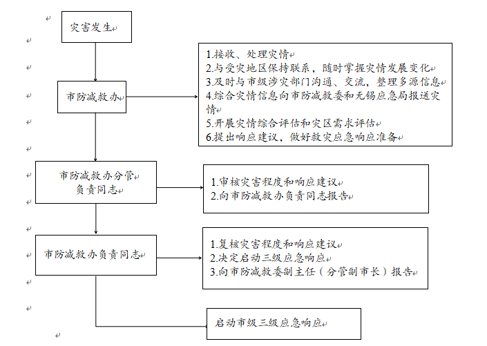 災(zāi)害發(fā)生后,市防減救辦經(jīng)分析評估,認(rèn)定災(zāi)情達到啟動條件,向市防減救辦主要負責(zé)同志提出啟動三級響應(yīng)的建議。市防減救辦主要負責(zé)同志決定啟動三級響應(yīng),并向市防減救委副主任報告。啟動市級三級應(yīng)急響應(yīng)按照以下流程進行: