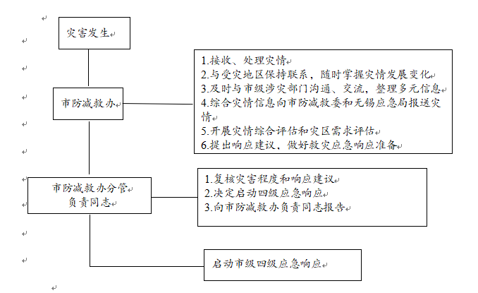 災(zāi)害發(fā)生后,市防減救辦經(jīng)分析評估,認(rèn)定災(zāi)情達到啟動條件,市防減救辦分管負責(zé)同志決定啟動四級響應(yīng),并向市防減救辦負責(zé)同志報告。啟動市級四級應(yīng)急響應(yīng)按照以下流程進行: