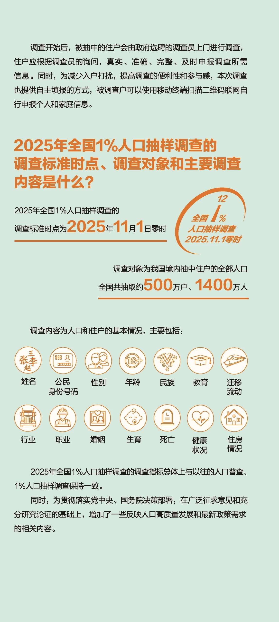 2025年全國1%人口抽樣調(diào)查正在進(jìn)行,9月15日至10月15日,調(diào)查員會進(jìn)行住房核查,核實(shí)抽中調(diào)查的住房是否有人居住,11月1日至11月15日,調(diào)查員將進(jìn)行入戶登記,江陰全市有137個(gè)村(居)委會,196個(gè)調(diào)查小區(qū)被抽取,涉及萬余戶,請大家要注意配合。