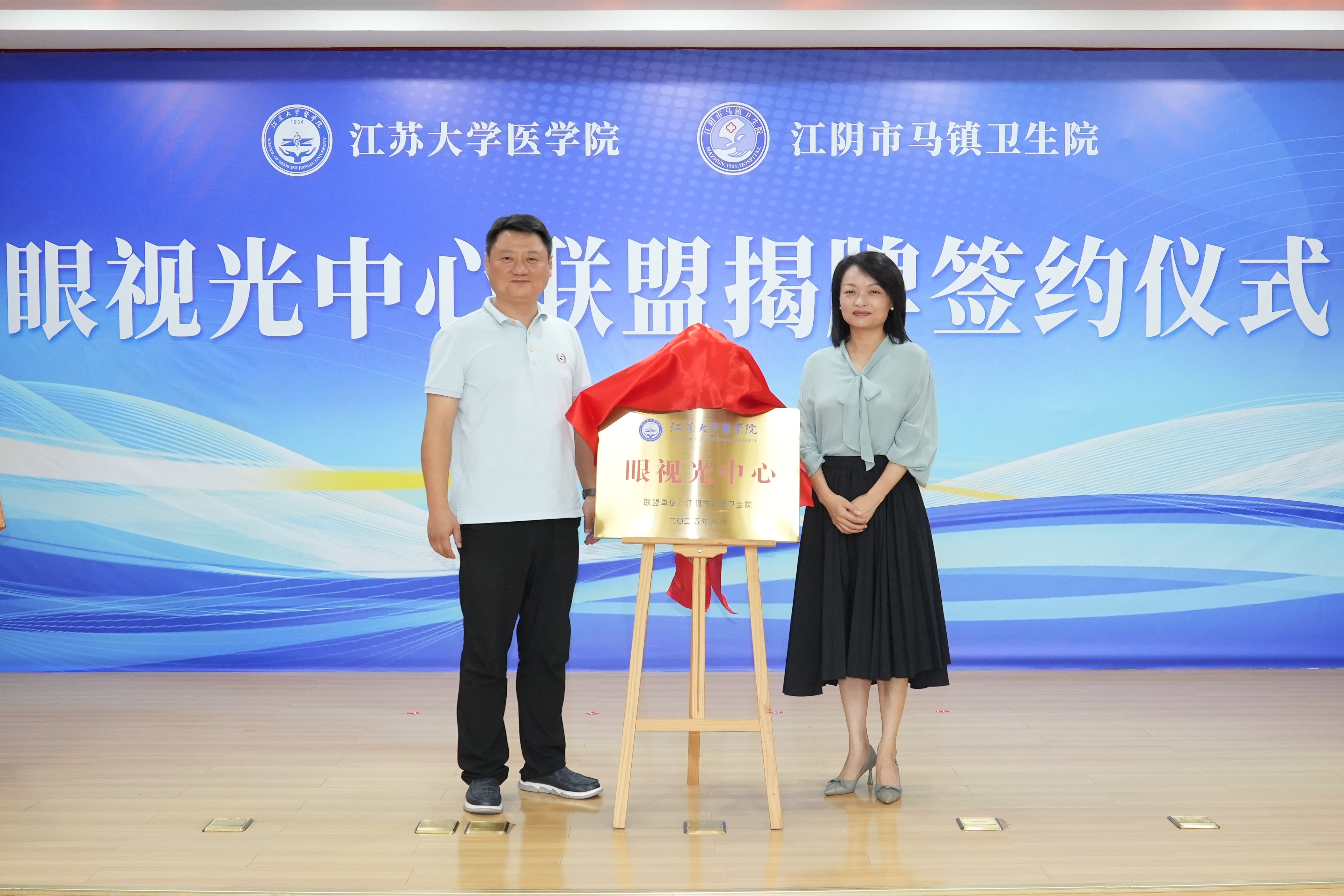 ▲江蘇大學(xué)醫(yī)學(xué)院黨委書記邱健與江陰市衛(wèi)生健康委黨委書記、主任胡瑩潔共同為“江蘇大學(xué)醫(yī)學(xué)院 江陰市馬鎮(zhèn)衛(wèi)生院眼視光中心聯(lián)盟”揭牌。