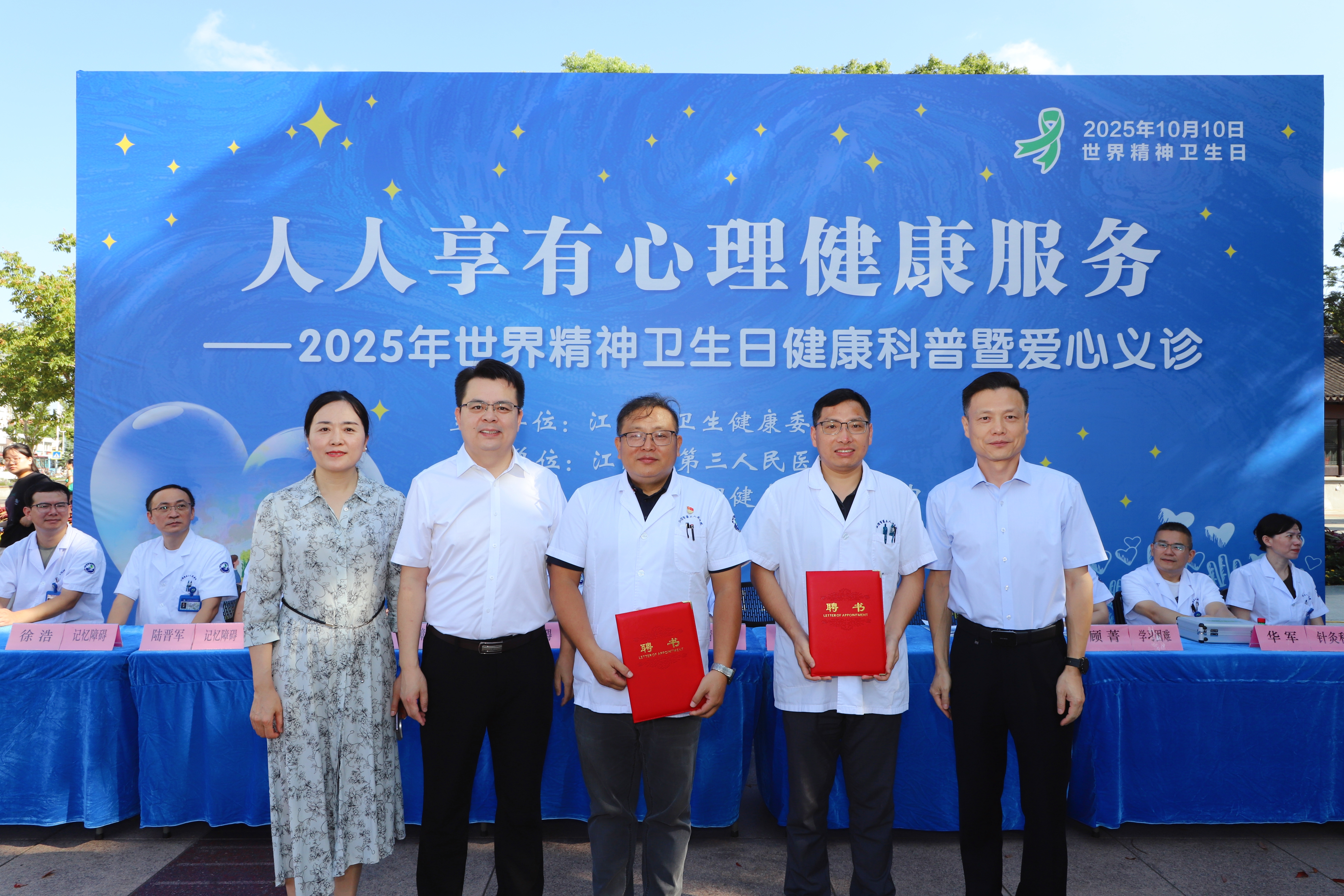 在“心理健康傳播公益大使”聘任儀式上,江陰市衛(wèi)生健康委副主任孫軍衛(wèi)、江陰市第三人民醫(yī)院黨委書記馬曉峰共同為南京醫(yī)科大學(xué)附屬腦科醫(yī)院譚俊華、滕昌軍教授頒發(fā)“心理健康傳播公益大使”聘書。未來,兩位公益大使將攜手第三人民醫(yī)院共同開展心理健康知識(shí)普及、專業(yè)培訓(xùn)與公益服務(wù),進(jìn)一步擴(kuò)大心理健康服務(wù)的覆蓋面與影響力,帶動(dòng)更多人關(guān)注心理健康。