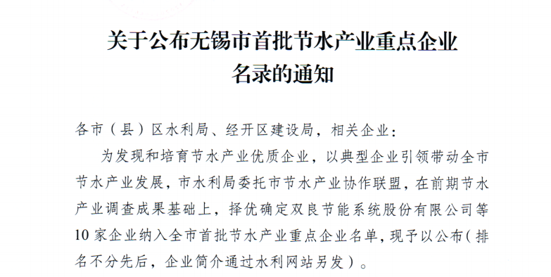壯大節(jié)水產(chǎn)業(yè),不僅是保障城市水安全的“壓艙石”,更是推動綠色低碳發(fā)展的“新引擎”。為發(fā)現(xiàn)和培育節(jié)水產(chǎn)業(yè)優(yōu)質(zhì)企業(yè),以典型企業(yè)引領(lǐng)帶動全市節(jié)水產(chǎn)業(yè)發(fā)展,近日,無錫市公布首批節(jié)水產(chǎn)業(yè)重點企業(yè)名錄(10家),雙良節(jié)能系統(tǒng)股份有限公司作為江陰市唯一一家上榜企業(yè)名列其中。