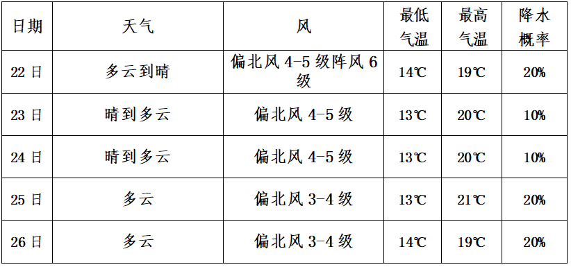據(jù)最新氣象資料顯示,22-25日以晴好天氣為主,早晨氣溫偏低,白天氣溫逐步小幅上升;預(yù)計(jì)26日后期還有一股弱冷空氣南下,最低氣溫將進(jìn)一步下降。請(qǐng)注意防范。
