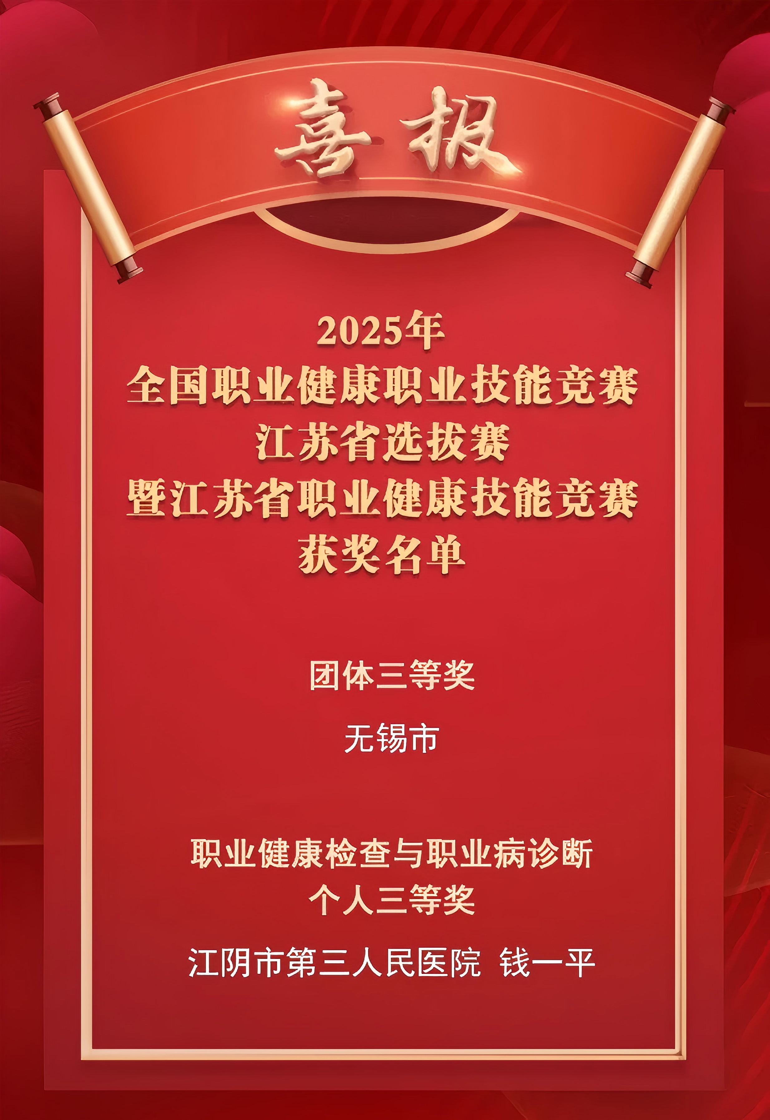 在省衛(wèi)生健康委員會(huì)、省委省級(jí)機(jī)關(guān)工委、省總工會(huì)舉辦的2025年全國(guó)職業(yè)健康職業(yè)技能競(jìng)賽江蘇省選拔賽暨江蘇省職業(yè)健康技能競(jìng)賽中,江陰市第三人民醫(yī)院錢一平榮獲職業(yè)健康檢查與職業(yè)病診斷個(gè)人三等獎(jiǎng),無(wú)錫市代表隊(duì)榮獲團(tuán)體三等獎(jiǎng)。