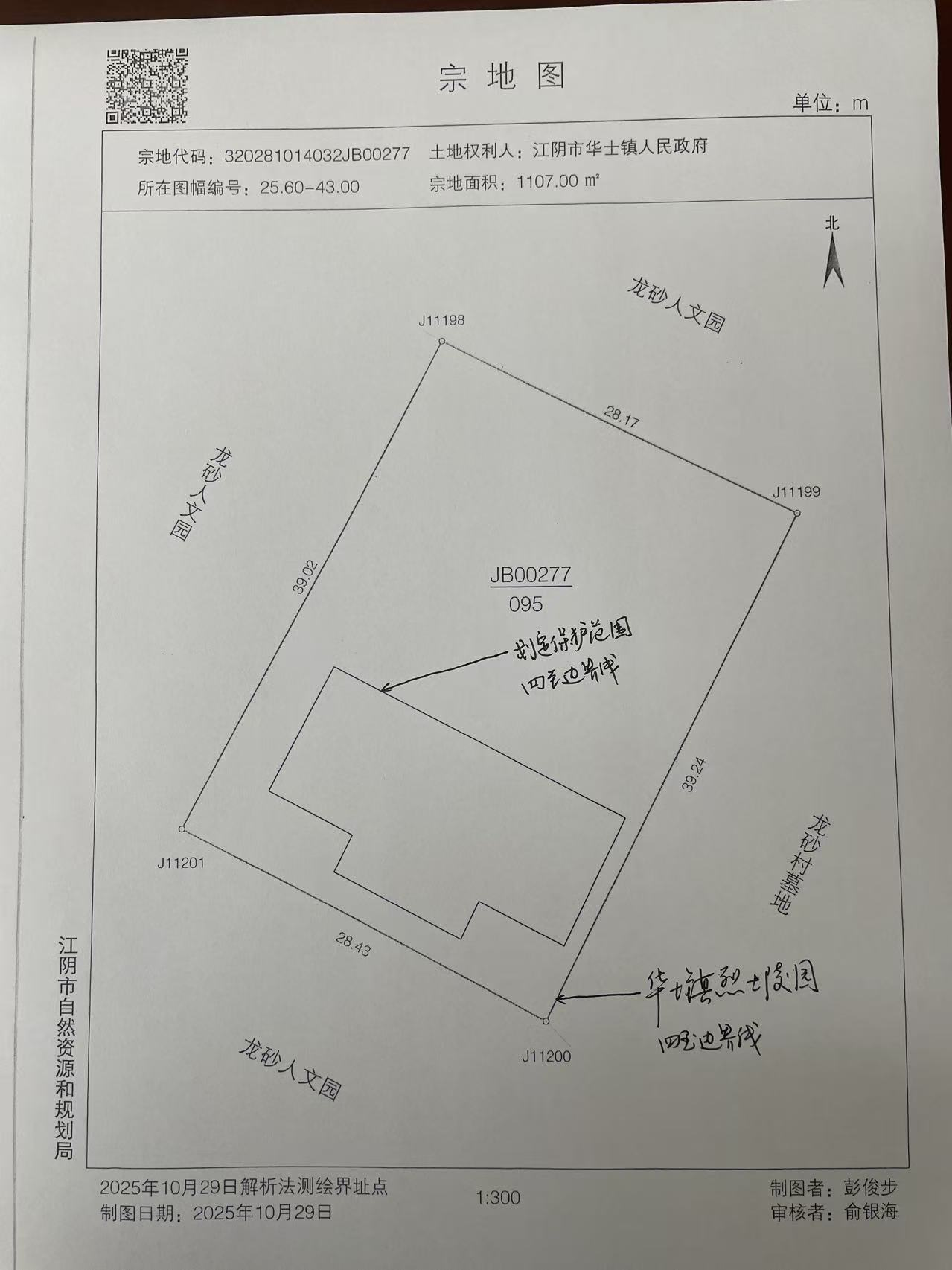 以華士鎮(zhèn)烈士陵園宗地圖(宗地代碼:320281014032JB00277,所在圖幅號:25.60-43.00等)為準,保護范圍確定以烈士陵園南墻為基準,東西各至圍墻以北安葬有烈士墓區(qū)域(如宗地圖中標示區(qū)域)。