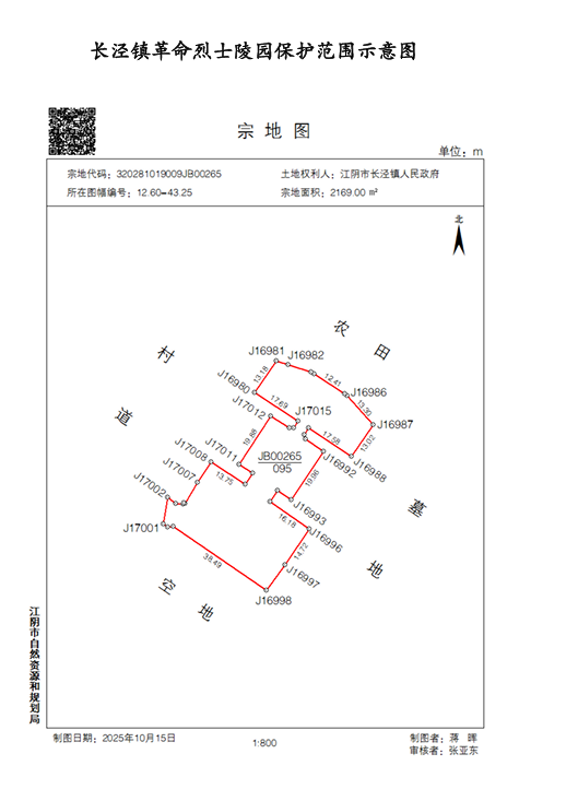長涇鎮(zhèn)革命烈士陵園保護(hù)范圍以宗地圖(宗地代碼:320281019009JB00265,所在圖幅編號(hào):12.60-43.25)為參照,具體保護(hù)范圍為:東至墓地;西至村道;南至空地;北至農(nóng)田。詳見附件1。