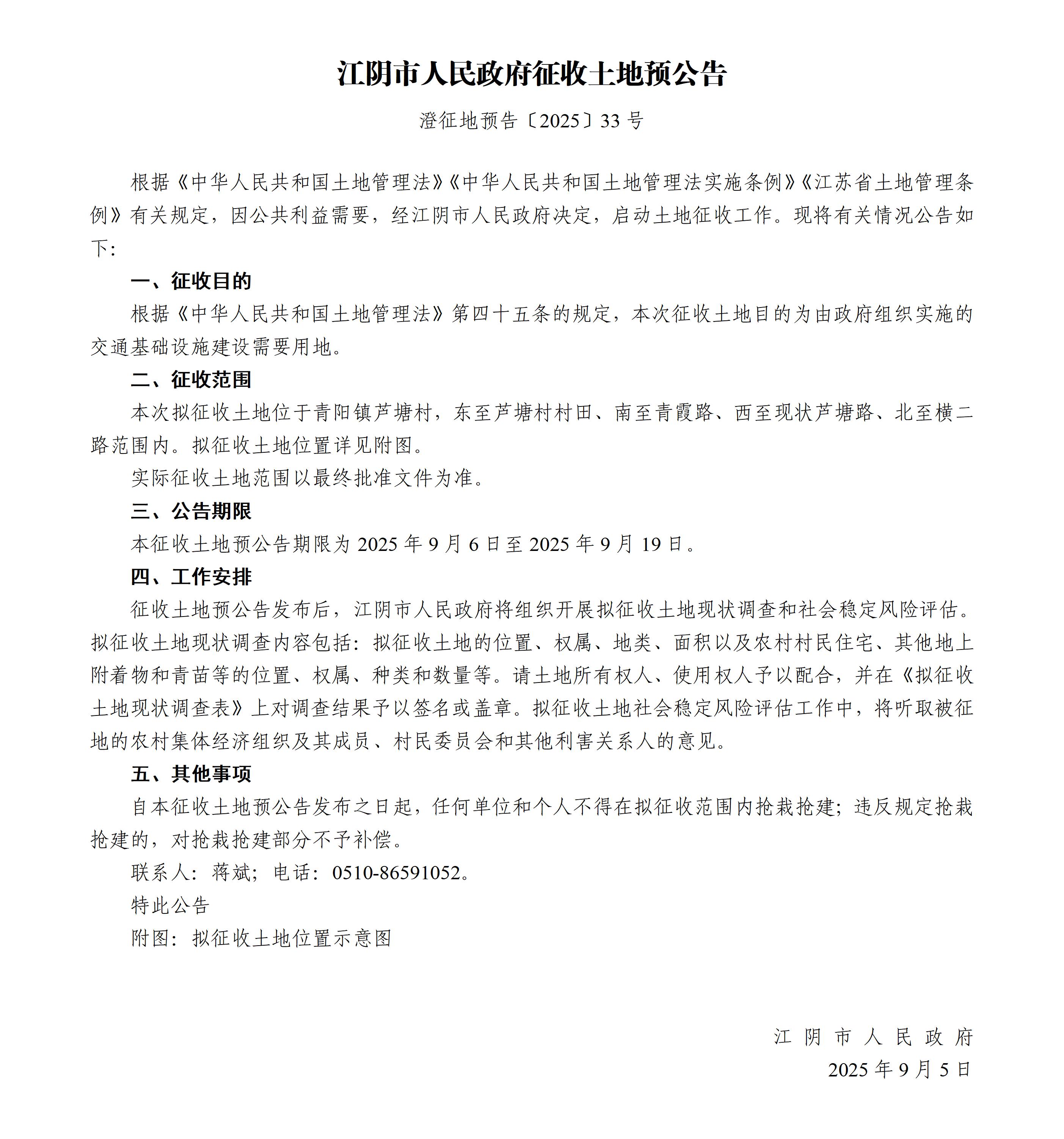 | 內(nèi)容概述 | 江陰市人民政府征收土地預(yù)公告澄征地預(yù)告〔2025〕33號 | ||||