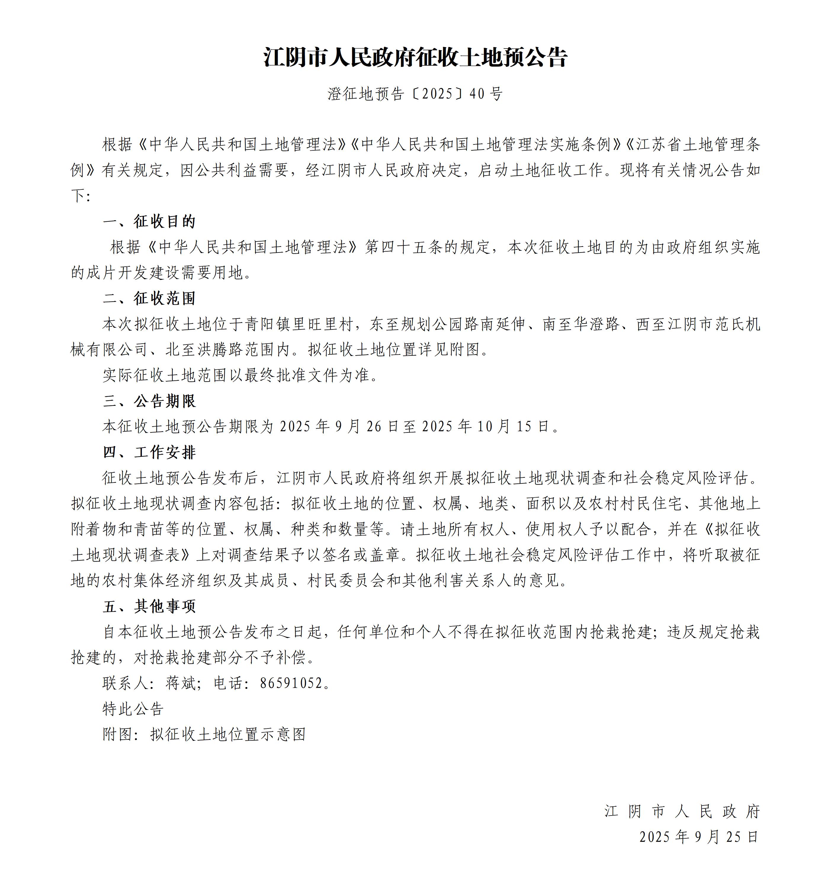 | 內(nèi)容概述 | 江陰市人民政府征收土地預(yù)公告澄征地預(yù)告〔2025〕40號 | ||||